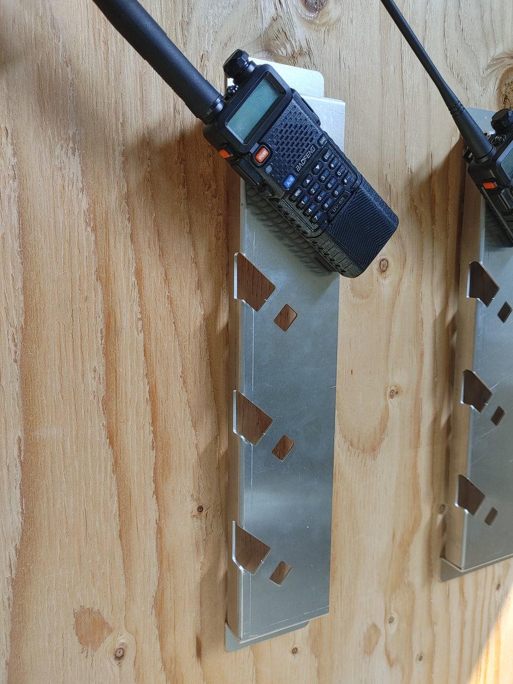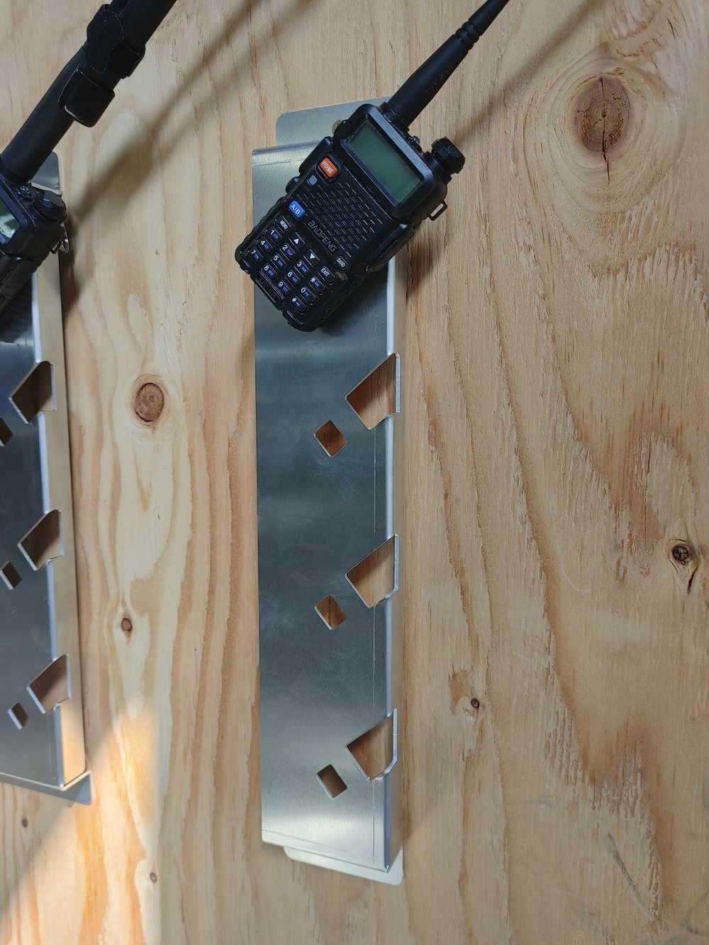 Designed to hold more radios in a smaller area. The racks allow the radios to actually clip into place and stay put when the pavement turns to dirt. Also great on any shop wall. Design supports the entire clip.